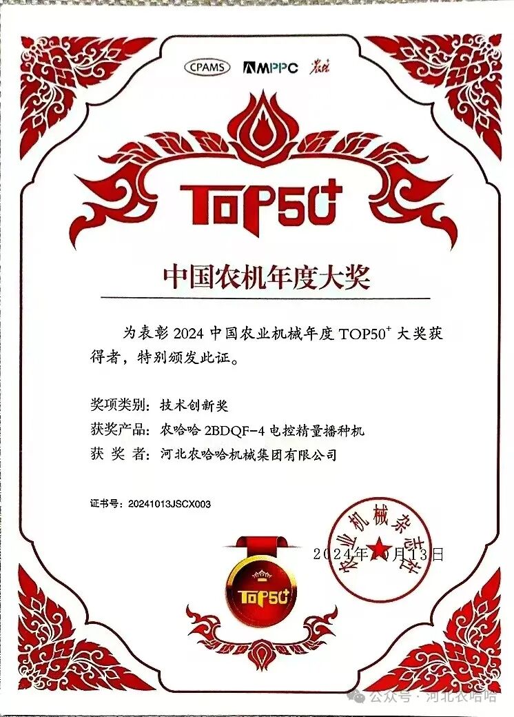 中国农业机械年度“TOP50+”的影响力是不言而喻的,农哈哈品牌深入人心,是全国农机用户对我们企业的认可和信赖,更是激励我们不断前行的不竭动力!