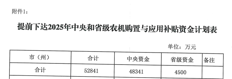 经研究,现将提前下达2025年中央和省级农机购置与应用补贴资金计划下达你们,并将有关事项通知如下。