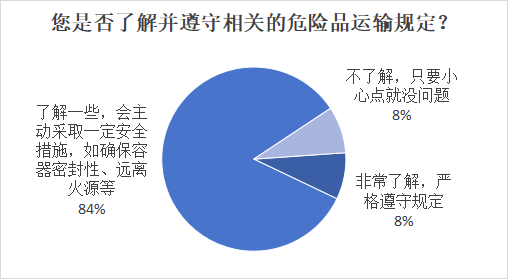 在法规遵守方面,大部分受访者(84%)对危险品运输规定有一定了解,同时会主动采取一定措施确保安全,例如保证容器的密封性、远离火源等。这表明大部分农户具备一定的安全意识, 但并未达到对法规完全了解、严格遵守的程度。仅有8%的人表示“非常了解,严格遵守规定”,说明农户对危险品运输方面的规则意识普遍不足。另外,还有 8% 的农户不了解相关规定,存在侥幸心理,认为只要小心点就没问题。