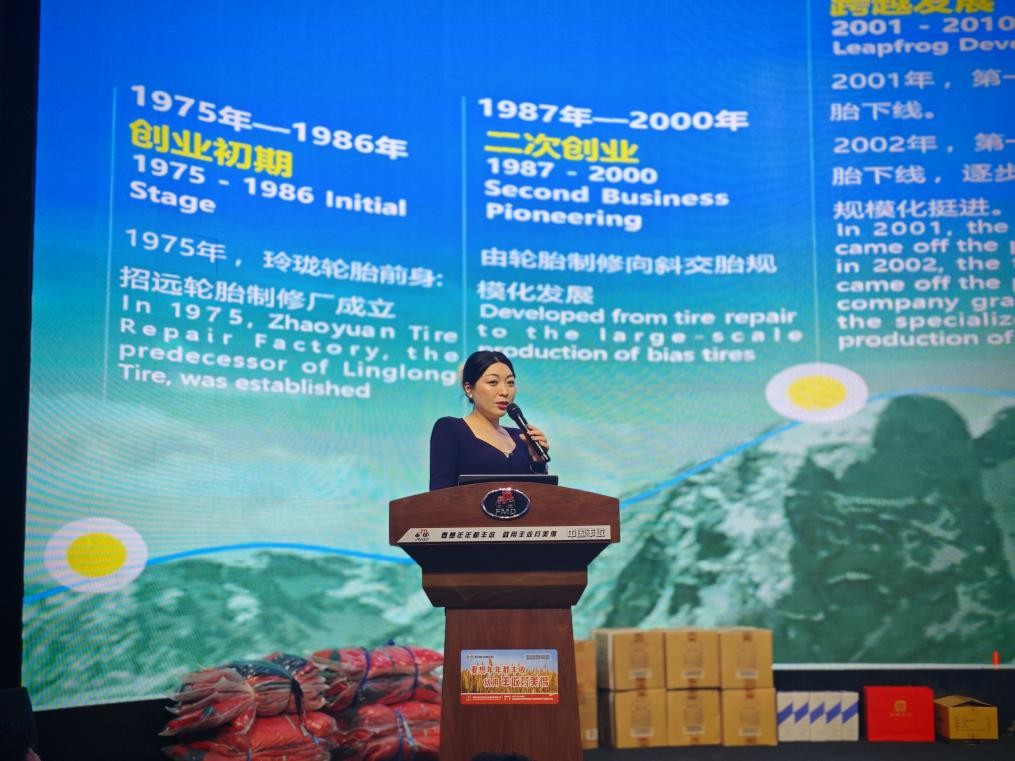 一拖(洛阳)柴油机有限公司总经理肖小赛、玲珑集团阿特拉斯轮胎(招远)有限公司总经理秦青上台致辞。