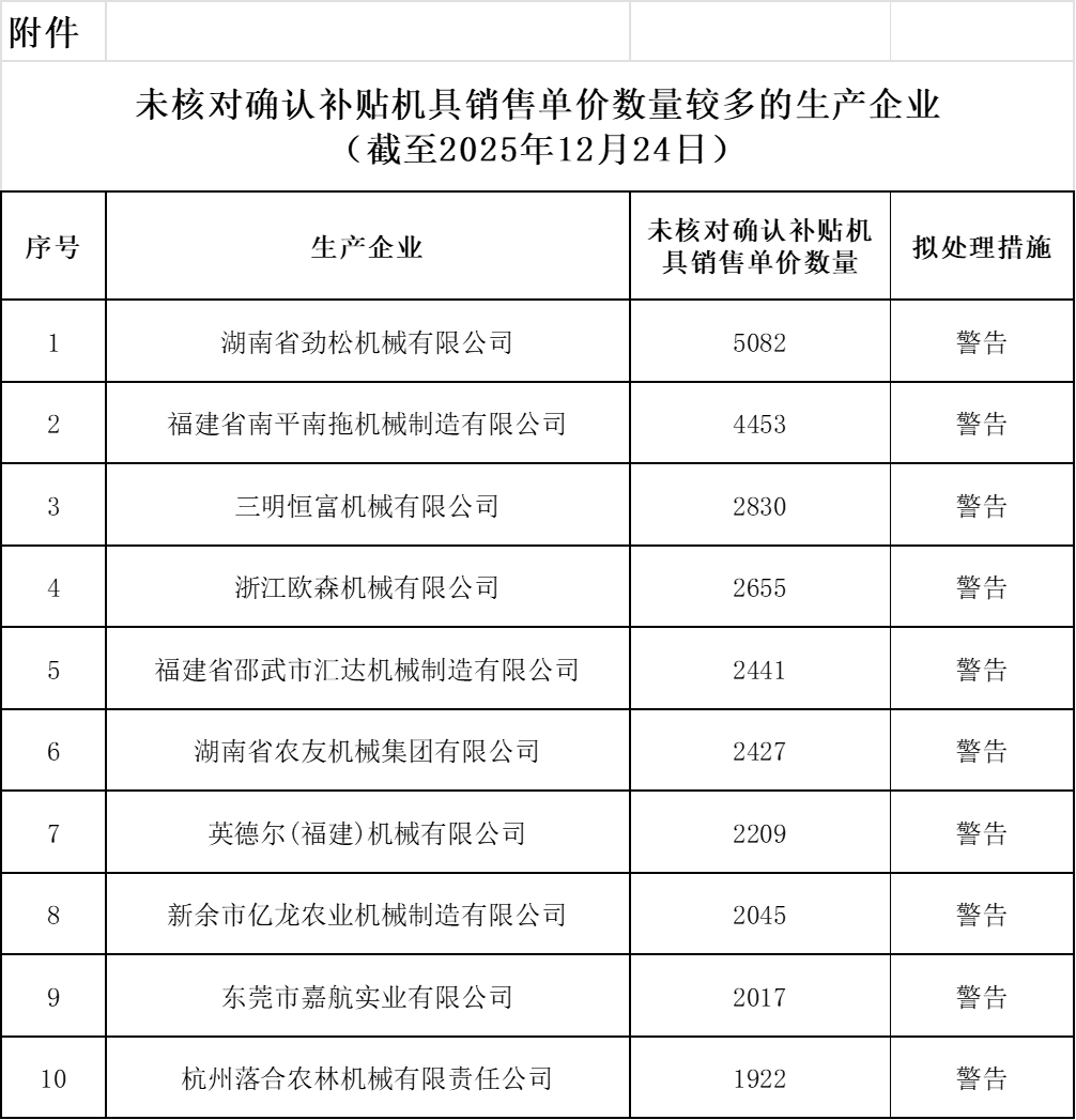按照农业农村部办公厅、财政部办公厅《农业机械购置补贴产品违规经营行为处理办法(试行)》(农办财〔2017〕26号)、《关于进一步加强农机购置补贴政策监管强化纪律约束的通知》(农办机〔2019〕6号)等文件有关规定,首批计划对未核对确认补贴机具销售单价数量较多的10家生产企业(详见附件)进行警告处理,并通过网络方式进行约谈告知。