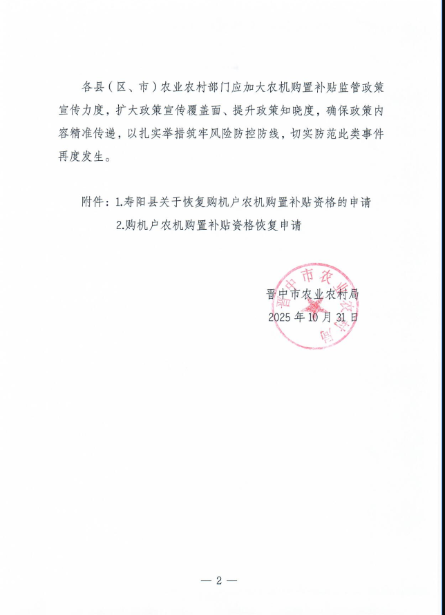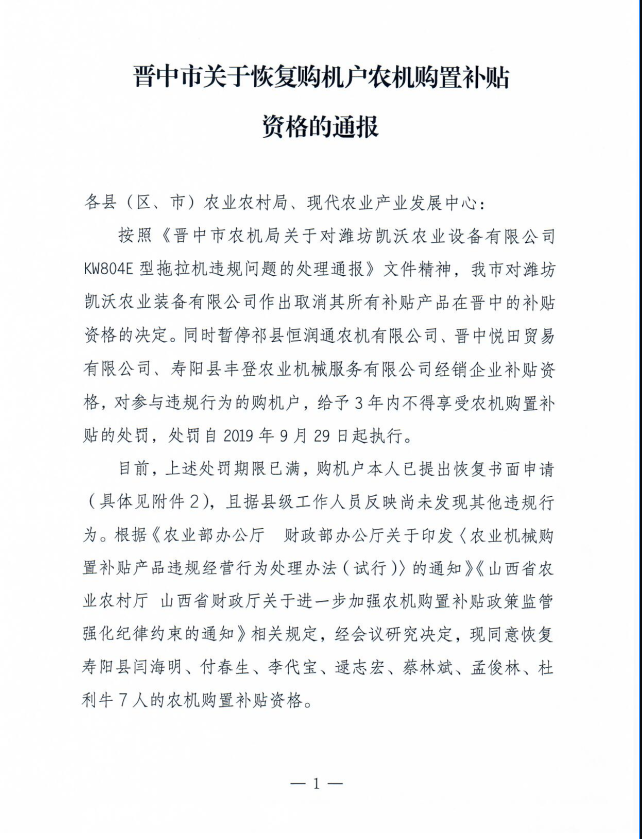 晋中市关于恢复购机户农机购置补贴资格的通报