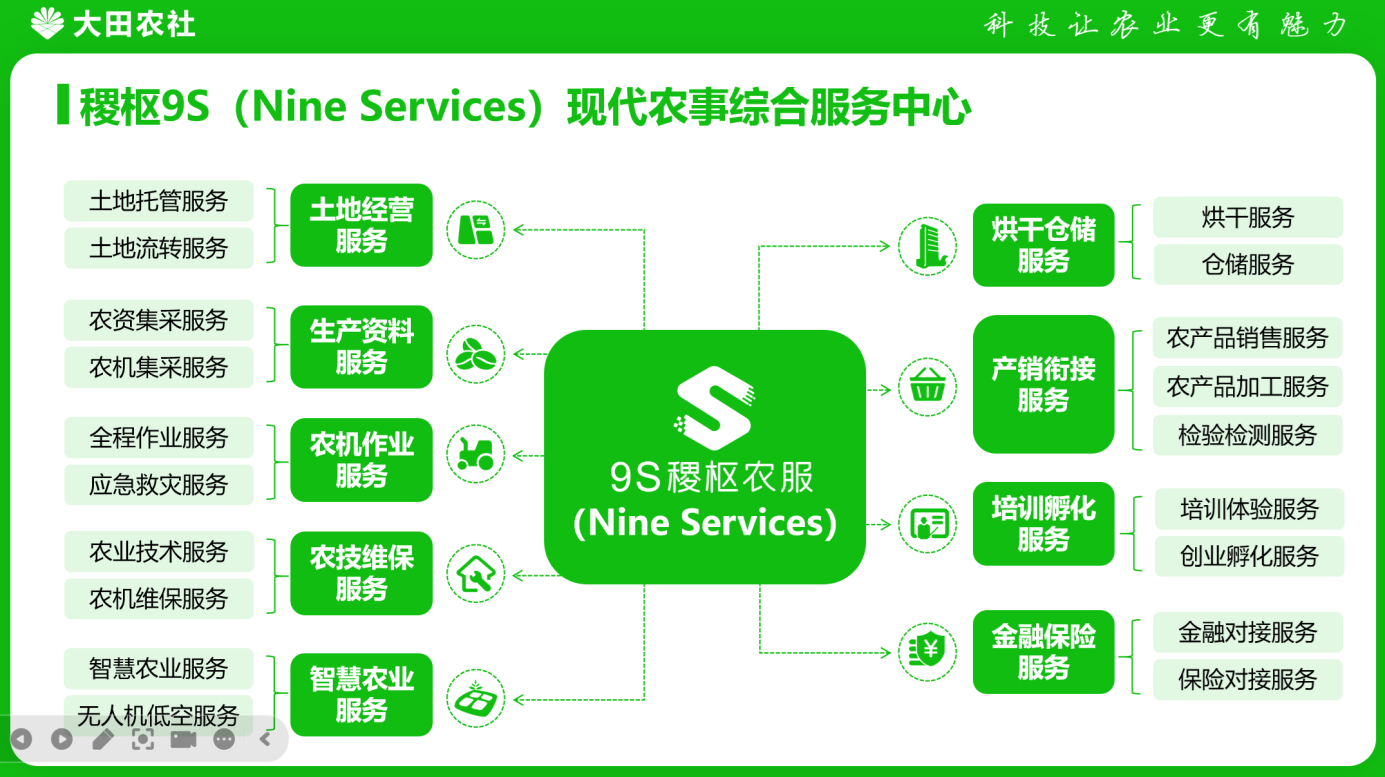 金色大田科技有限公司副总裁相东详细介绍了公司“稷枢9S现代农事综合服务中心”建设方案。相东表示,金色大田自2016年就开始探索现代农事综合服务中心相关工作,今年中央一号文件明确将“发挥现代农事综合服务中心作用”列入其中。金色大田提供的现代农事综合服务中心解决方案将在土地经营、生产资料、农机作业、农技服务、智慧农业、烘干仓储、产销对接、金融保险、培训孵化等九个方面为现代农业生产提供支撑服务。
