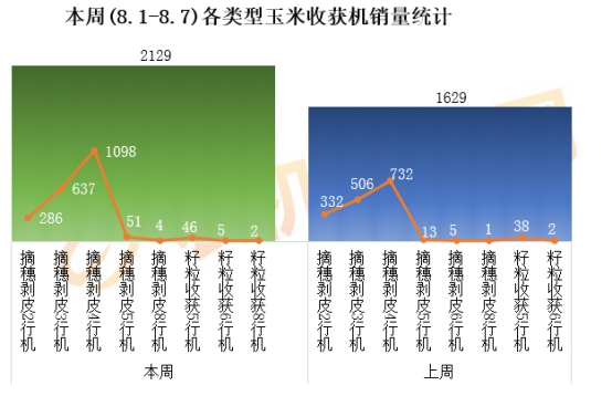 环比上周,玉米收获机整体销量上涨了30.7%。本周销量前十产品,环比上周,只有河北英虎生产的4YZB-3D的销量是下滑的,其余9款产品销量都有明显上涨。本周前十产品涉及5家生产企业,河北英虎有3款产品上榜,雷沃重工、山东巨明和山东金大丰各有2款产品上榜,唐山利军机械制造有限公司有1款茎穗兼收4行玉米收产品上榜。前十产品包括6款轮式摘穗剥皮4行玉米机,全国平均售价从17.5万元到20.4万元不等。此外,还有摘穗剥皮型3行玉米机2款,履带式摘穗剥皮2行玉米机和茎穗兼收4行玉米机各1款,前十产品均为摘穗剥皮型玉米收获机。