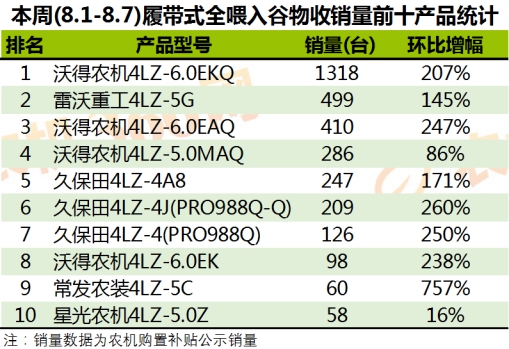 环比上周,履带式谷物收整体销量上涨了168%。本周销量前十产品,销量都有大幅增加,涨幅最小的是星光农机4LZ-5.0Z,,同比上涨了16%;涨幅最大的常发农装4LZ-5C,上涨幅度高达757%。本周前十产品涉及5家生产企业,沃得农机有4款产品上榜,久保田有3款产品上榜,雷沃重工、常发农装和星光农机各有一款产品上榜。前十产品包括3款6kg/s喂入量机型,4款5公斤和3款4公斤机型,第五至七名的久保田产品全国平均售价较高,平均售价在15.8到18.7万元之间;其余7款国产水稻收割机,全国平均售价从9.8万元到12万元不等,国产水稻收割机产品平均售价差异已是很小。