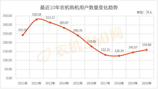 最近10年(2011年-2020年),平均每年有215万人购买了农机产品,农机购机人数呈现总体下行的趋势,在2018年后购机用户数量逐步趋于平稳。从近10年农机购机用户数量变化趋势来看,2012年是10年来购机人数增长做多、涨幅最大的年份,同时也是购机人数最多的年份,超过330万人,随后的6年,农机购买人数逐年递减,至2018年,购机人数跌至10年来最少,仅有126万人,与购机人数最多的2012年相比,减少了204万人,跌幅达62%。截止目前,农机产品的购买人数已经连续5年低于10年均值,但最近2年,购机人数呈现小幅增加的趋势,截止到2020年10月23日,2020年的购机人数已经超过2019年去年的购机人数,已有159.84万人购机。