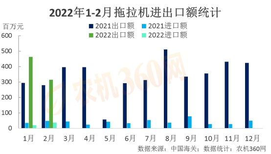 据农机360网整理的海关总署公布的数据分析,2021年2月份拖拉机进出口总额为3.51亿元,环比下降27.34%,同比上涨7.56%。其中,2月份出口额为3.15亿元,环比下降31.83%,同比上涨12.94%;进口额为3567万元,环比上涨73.79%,同比下降24.28%。2022年,拖拉机累计进出口总额达8.34亿元,其中累计出口额为7.77亿元,进口额为0.56亿元。
