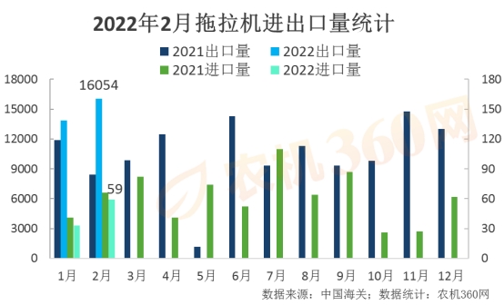 从2021年1-2月的进出口数据来看,我国拖拉机的出口量,远远大于进口量。2月份出口16054台,环比上涨15.68%,同比上涨90.46%;进口59台,环比上涨78.79%,同比下降10.61%。2022年,我国拖拉机累计出口2.9932万台,进口92台。