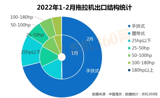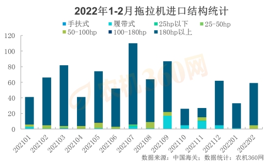 2022年1-2月份,进口拖拉机以180及以上马力段的轮式拖拉机为主,其他类型拖拉机每月进口量都不足10台。